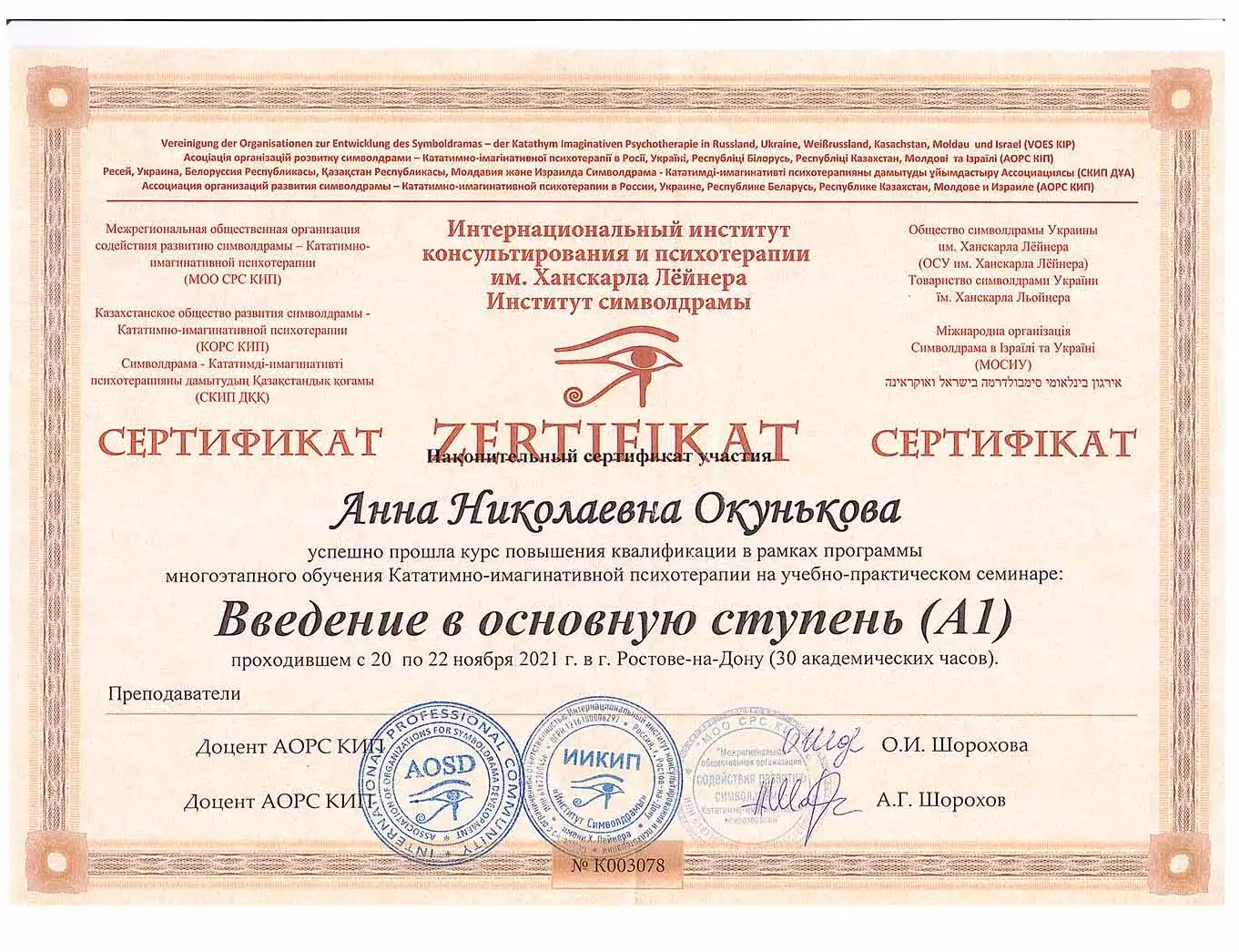 - 2021 - Интернациональный институт консультирования и психотерапии им. Ханскарла Лёйнера. Институт символдрамы (Сертификат о прохождении курса повышения квалификации в рамках программы обучения Кататино-имагинативной психотерапии)