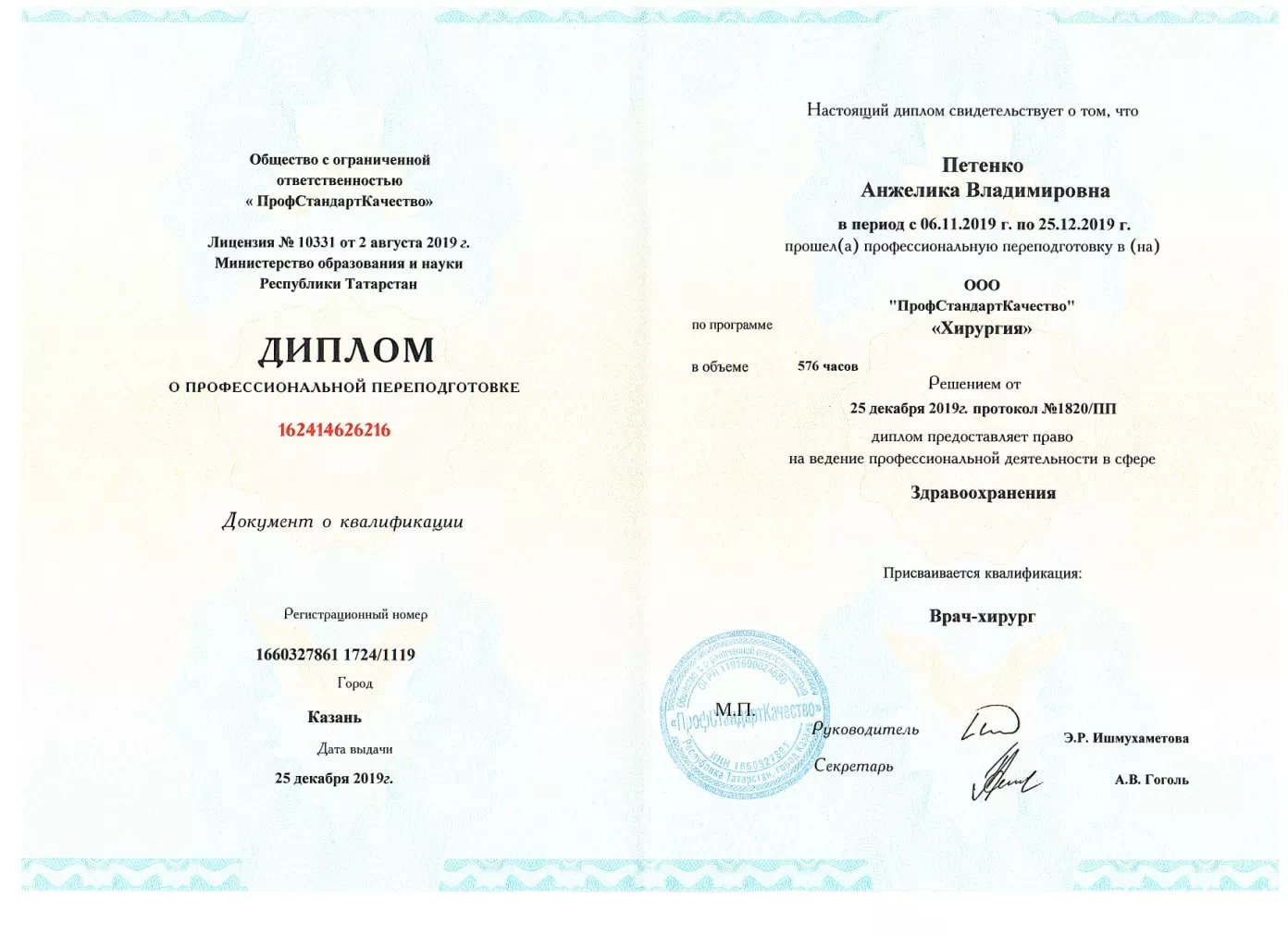 - 2019 — ПрофСтандартКачество (квалификация: врач-хирург);